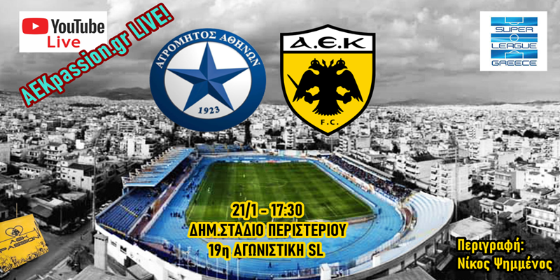 Μετά την ισοπαλία με σκορ 2-2 απέναντι στον Παναθηναϊκό την προηγούμενη αγωνιστική στη Νέα Φιλαδέλφεια, και τον αποκλεισμό μεσοβδόμαδα στο Κύπελλο από τον Άρη στην Θεσσαλονίκη, η ΑΕΚ καλείται να αναζητήσει την εκτός έδρας νίκη κόντρα στον Ατρόμητο. Σε αυτή την προσπάθεια το AEKPASSION και ο Νίκος Ψημμένος θα βρίσκονται στο «Δημοτικό Στάδιο του Περιστερίου» και θα μεταφέρουν στους ακροατές την ατμόσφαιρα και τα πιο σημαντικά στοιχεία του παιχνιδιού, που διεξάγεται στο πλαίσιο της 19ης αγωνιστικής της εφετινής Superleague.