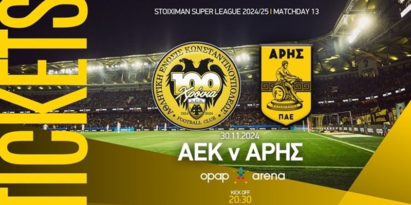 Η ΠΑΕ ΑΕΚ ανακοινώνει ότι αύριο Τετάρτη στις 16:00 θα αρχίσει η διάθεση των εισιτηρίων για το παιχνίδι της 13ης αγωνιστικής της Super League με τον Άρη, που θα διεξαχθεί το Σάββατο 30 Νοεμβρίου στις 20.30, στην OPAP Arena.