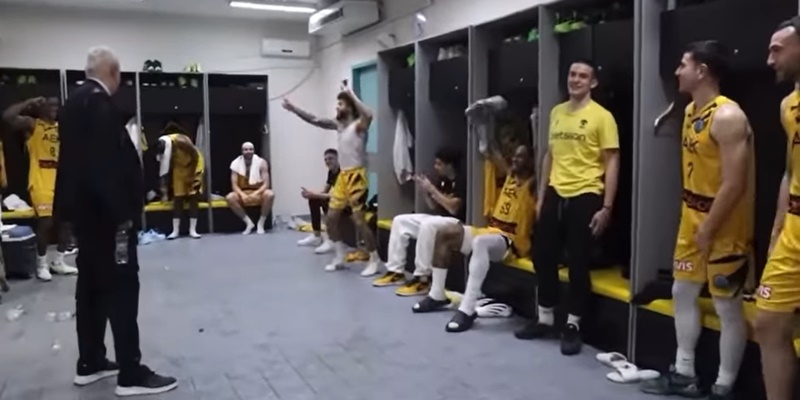 Οι παίκτες της ΑΕΚ Betsson BC μετά την πρόκριση της ομάδας στο Final 4 του Basketball Champions League προσέφεραν ενα αποθεωτικό… μπουγέλο προς τον Ντράγκαν Σάκοτα στα αποδυτήρια της Sunel Area.