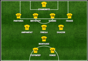 Η ΑΕΚ παρατάχθηκε ξανά με Πήλιο, Ραντόνια στα άκρα της άμυνας και τους Μάνταλο, Πινέδα να καλύπτουν τον άξονα, στις θέσεις που συνήθως είναι τουλάχιστον ένας από τους απόντες Σιμάνσκι ή Γιόνσον.