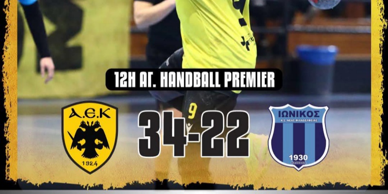 Η ΑΕΚ συνεχίζει την καταπληκτική της πορεία στην Handball Premier, καθώς επικράτησε 34-22 του Ιωνικού Νέας Φιλαδέλφειας στο «Γ. Κασιμάτης», στο πλαίσιο της 12ης αγωνιστικής του πρωταθλήματος. Η «Ένωση» ήταν καταιγιστική εξ αρχής και δεν άφησε κανένα περιθώριο αντίδρασης. Ο Φρεντερίκ Μπουζόν δεν είχε διαθέσιμους τους Μάτιτς (βρίσκεται στην Εθνική Νορβηγίας), Σμιντ (γαστρεντερίτιδα) και Γκαρέν (επιστρέφει στις προπονήσεις τη Δευτέρα).