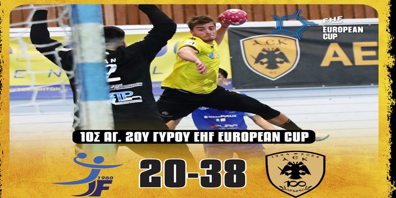 Εύκολο βράδυ είχε στην αίθουσα «Γ. Κασιμάτης» του ΟΑΚΑ η ΑΕΚ που αγωνίστηκε ως τυπικά φιλοξενούμενη απέναντι στην ιταλική, Τζούνιορ Φαζάνο, επικρατώντας εύκολα με σκορ 20-38 και παράλληλα σφραγίζοντας από σήμερα την πρόκριση. Πρώτοι σκόρερς για την ομάδα του Μπουζόν οι Σμιντ-Κειτά, οι οποίοι πέτυχαν από 6 τέρματα ο καθένας ο. Το δεύτερο παιχνίδι ανάμεσα στις δύο ομάδες θα πραγματοποιηθεί αύριο στις 19:30 στο ίδιο γήπεδο.