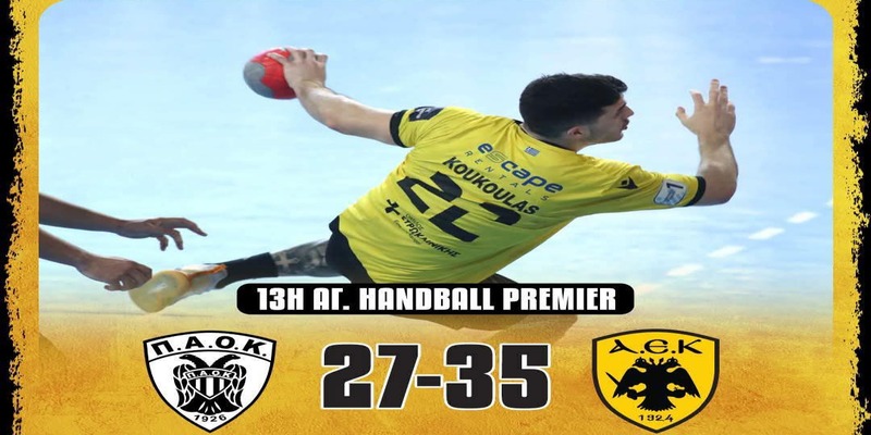 Η ΑΕΚ επικράτησε εύκολα στο «Σπίτι του Χάντμπολ» στη Θεσσαλονίκη του γηπεδούχου ΠΑΟΚ με 27-35 στο πλαίσιο της 13ης αγωνιστικής και συνεχίζει αήττητη με 13 νίκες σε ισάριθμα παιχνίδια στο πρωτάθλημα και 19/19 σε όλες τις διοργανώσεις. Στο πρώτο μέρος η ΑΕΚ παρόλο την μαχητικότητα των γηπεδούχων είχε τα ηνία και μπήκε στα αποδυτήρια με 12-15. Στο δεύτερο μέρος η ομάδα του Μπουζόν ανέβασε ταχύτητα με αποτέλεσμα να ξεφύγει από τον αντίπαλο της και να πανηγυρίσει μια άνετη νίκη με τελικό σκορ 27-35.