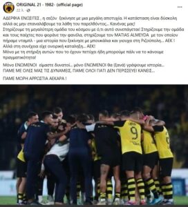 Ενωτικό μήνυμα έστειλε μέσω ανάρτησης στο Facebook η Original 21. Ο μεγαλύτερος σύνδεσμος οργανωμένων οπαδών της ΑΕΚ, ενόψει της αποψινής πρεμιέρας στο πρωτάθλημα με τον ΟΦΗ, αναφέρεται στο ότι «η σεζόν ξεκίνησε με μια μεγάλη αποτυχία», καλώντας όμως να «μην επαναλάβουμε τα λάθη του παρελθόντος», εκφράζοντας παράλληλα τη στήριξή της στην ομάδα και τον προπονητή, Ματίας Αλμέιδα, με τον οποίον «πήραμε νταμπλ», σημειώνοντας πως «μόνο με τη στήριξη αυτών που το έχουν πετύχει ήδη μπορούμε πάλι να το κάνουμε πραγματικότητα!».