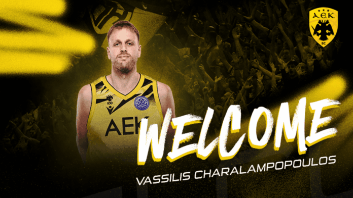 «Η ΑΕΚ BC βρίσκεται στην ευχάριστη θέση ν’ ανακοινώσει, ότι συνήψε συμφωνία με τον Βασίλη Χαραλαμπόπουλο (27 χρ., 2μ.04).