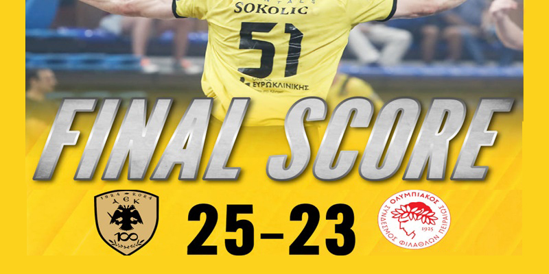 Με την επίθεσή της να δουλεύει εξαιρετικά, η ΑΕΚ προηγήθηκε με 22-21 στο 55′, και ενώ ένα λεπτό αργότερα κέρδισε πέναλτι και δίλεπτη αποβολή του Παπαβασίλη, με τον Μίλερ την γραμμή του πέναλτι να κάνει το 23-21 στο 56′! Με τον κόσμο να έχει μπει για τα καλά στην εξίσωση του αγώνα, οι «κιτρινόμαυροι» διατήρησαν αυτό το +2 (24-22) μέχρι το 59′, με τον Πασιά να μειώνει σε 24-23, 45 δευτερόλεπτα πριν το φινάλε. Με τρομερή κίνηση του Λιάπη στην επόμενη επίθεση, η ΑΕΚ έκανε το 25-23, είκοσι δεύτερα πριν το τέλος, παίρνοντας τη νίκη και ισοφαρίζοντας σε 1-1 τη σειρά!