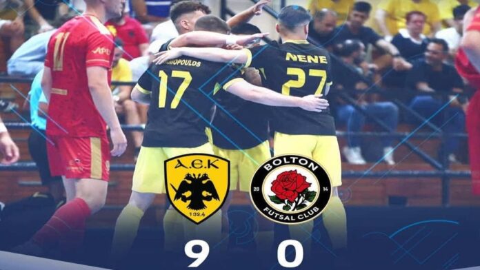 Δεν δυσκολεύτηκε να φθάσει στη νίκη η ΑΕΚ, καθώς επικράτησε 9-0 της πρωταθλήτριας Αγγλίας Μπόλτον, στο «Γ. Κασιμάτης», στην 2η αγωνιστική του Group H του Preliminary Round του UEFA Futsal Champions League. Η «Ένωση», πλέον, παίζει την πρόκριση στο Main Round την Παρασκευή (29/08, 21:30), απέναντι στην Βέζπρεμ, ξανά στο Κλειστό του ΟΑΚΑ. Να σημειωθεί πως η ΑΕΚ έχει υπέρ της την ισοβαθμία, σε περίπτωση ισοπαλίας, λόγω της καλύτερης διαφοράς γκολ στα δύο πρώτα ματς.