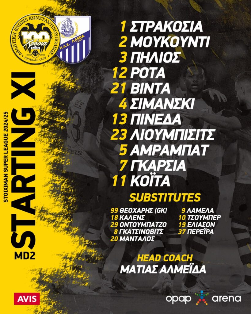 Χωρίς αλλαγές σε σχέση με το παιχνίδι της 1ης αγωνιστικής με τον ΟΦΗ κατεβάζει και σήμερα την ΑΕΚ εναντίον της Λαμίας ο Ματίας Αλμέιδα.