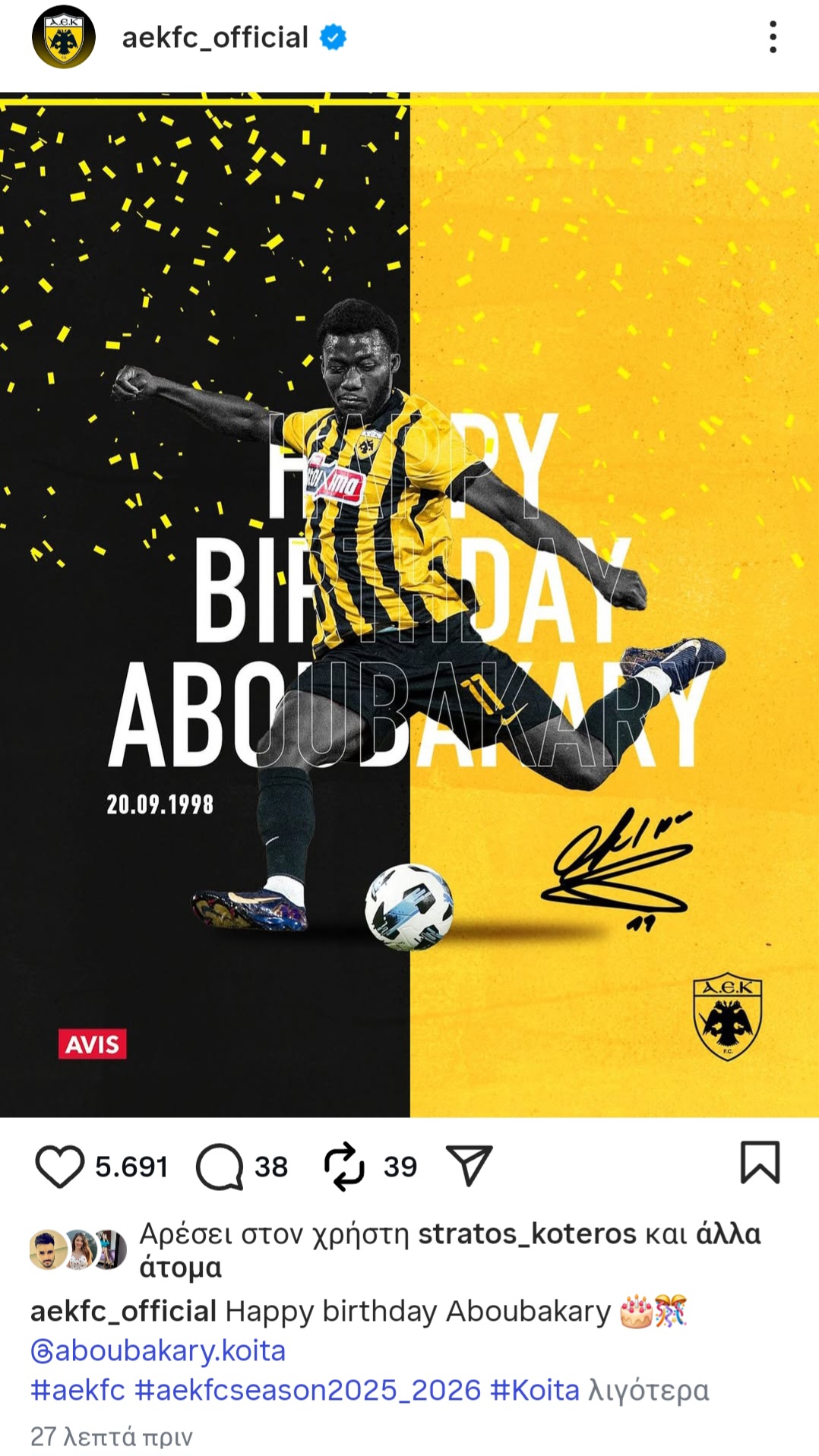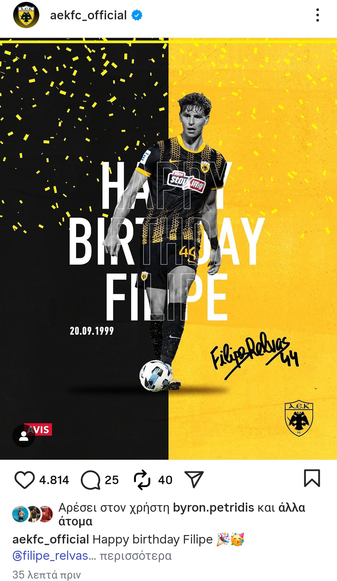 Ο Φιλίπε Ρέλβας σήμερα συμπληρώνει 26 χρόνια ζωής και ο Αμπουμπακαρί Κοϊτά 27 και η «κιτρινόμαυρη» διοίκηση τους ευχήθηκε στα μέσα κοινωνικής δικτύωσης.