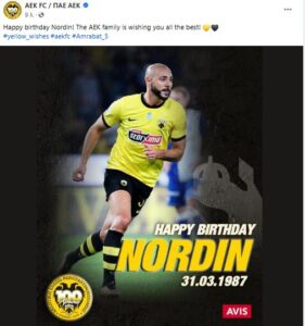 Τα 37 κλείνει ο εξτρέμ της Ένωσης, με την ΠΑΕ ΑΕΚ να του εύχεται χρόνια πολλά. Στην σχετική ανάρτηση στο Facebook, αναφέρεται συγκεκριμένα στα αγγλικά: «Χρόνια πολλά Νόρντιν! Η οικογένεια της ΑΕΚ σου εύχεται τα καλύτερα».