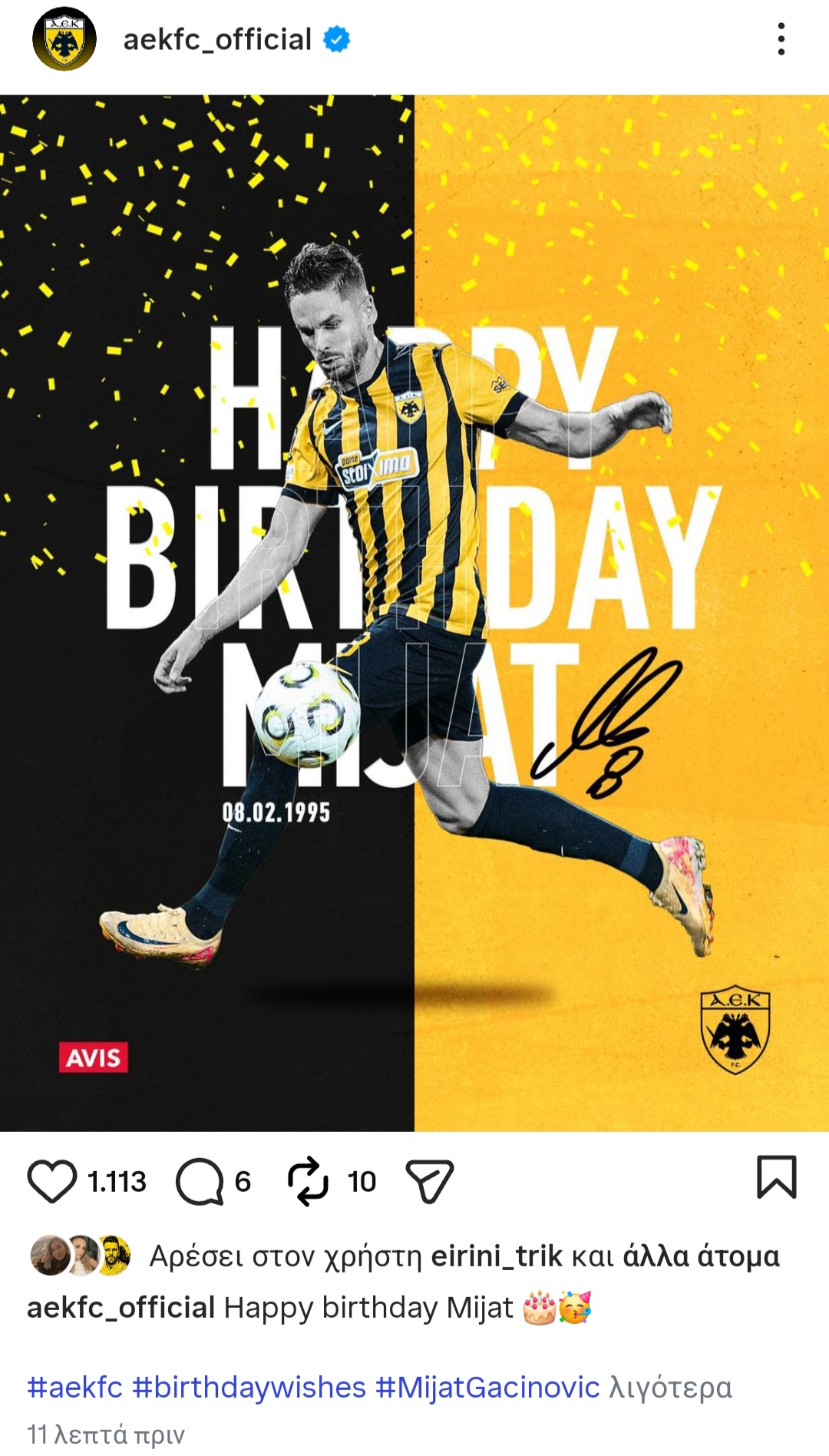Γενέθλια σήμερα για τον Μιγιάτ Γκατσίνοβιτς που συμπληρώνει 31 χρόνια ζωής. Η ΠΑΕ ΑΕΚ ευχήθηκε στον «Γκάτσι» στα social media.