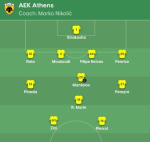 Η ενδεκάδα της ΑΕΚ: Στρακόσα, Ρότα, Πενράις, Μουκουντί, Ρελβας, Μανταλος Μάριν, Περέιρα, Πινέδα. Ζίνι, Πιερό