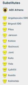 Στον πάγκο βρίσκονται οι: Μπρινιόλι, Αγγελόπουλος, Πήλιος Βίντα, Κοσίδης Γιόνσον, Λιούμπισιτς, Κοϊτά, Κουτεσα, Κολιμάτσης, Γκατσίνοβιτς, Γιόβιτς