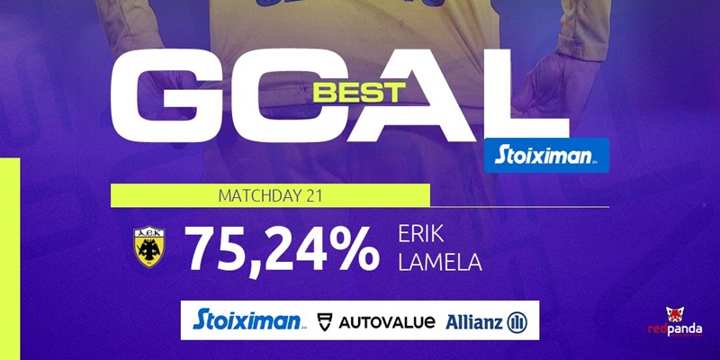 Το απίστευτο γκολ του Έρικ Λαμέλα κόντρα στον ΠΑΟΚ αναδείχτηκε ως το κορυφαίο της 21ης αγωνιστικής της Super League με ποσοστό 75,24%.