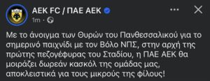 «Με το άνοιγμα των Θυρών του Πανθεσσαλικού για το σημερινό παιχνίδι με τον Βόλο ΝΠΣ, στην αρχή της πρώτης πεζογέφυρας του Σταδίου, η ΠΑΕ ΑΕΚ θα μοιράζει δωρεάν κασκόλ της ομάδας μας, αποκλειστικά για τους μικρούς της φίλους!