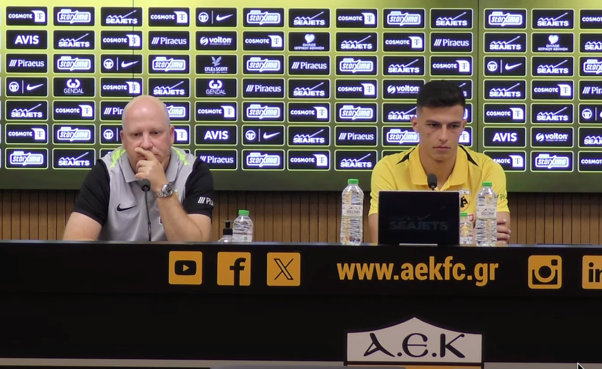 Ο προπονητής της ΑΕΚ, Μάρκο Νίκολιτς, και ο ποδοσφαιριστής Σταύρος Πήλιος εκπροσώπησαν την ΑΕΚ στη συνέντευξη Τύπου πριν από τον αυριανό, καθοριστικό αγώνα με τον Άρη Λεμεσού (14/08, 21:00) στην OPAP Arena, στη Νέα Φιλαδέλφεια, για τον 3ο προκριματικό γύρο του UEFA Conference League.
