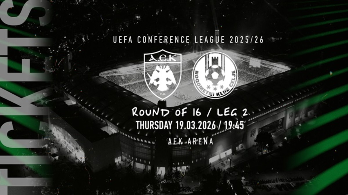 Η ΠΑΕ ΑΕΚ ενημερώνει τους φιλάθλους της ότι άρχισε η διαδικασία αγοράς εισιτηρίων αποκλειστικά για τους κατόχους εισιτηρίων διαρκείας, με σκοπό τη διασφάλιση της θέσης τους για τον εντός έδρας αγώνα της ομάδας μας με τη NK Celje, για τη φάση των «16» του UEFA Conference League, που θα διεξαχθεί την Πέμπτη 19 Μαρτίου στις 19:45, στην ΑΕΚ Arena.