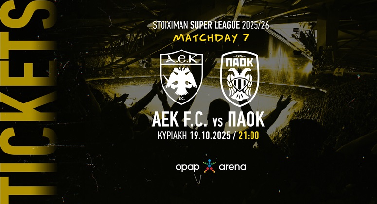 ”Η ΠΑΕ ΑΕΚ ανακοινώνει ότι άρχισε η διάθεση των εισιτηρίων για το ματς της 7ης αγωνιστικής του Πρωταθλήματος απέναντι στο ΠΑΟΚ, που θα διεξαχθεί την Κυριακή 19 Οκτωβρίου στις 21:00, στην OPAP Arena.