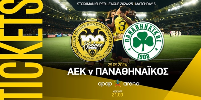 Η ΠΑΕ ΑΕΚ ανακοινώνει ότι αύριο Πέμπτη (19/9) στις 14:00 θα ξεκινήσει η διάθεση των εισιτηρίων για το ματς της 6ης αγωνιστικής του Πρωταθλήματος με τον Παναθηναϊκό, που θα διεξαχθεί την Κυριακή 29 Σεπτεμβρίου στις 21.00, στην OPAP Arena.