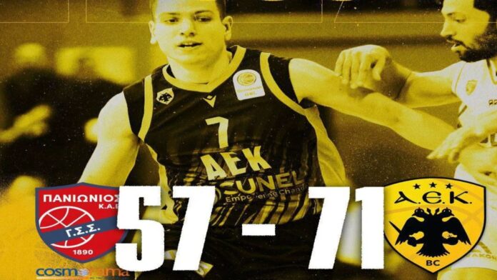 Η ΑΕΚ έβγαλε ενέργεια στο παρκέ και κατάφερε να επιβληθεί στο ΔΑΚ Γλυφάδας του Πανιωνίου με 57-71 στο πλαίσιο της 25ης αγωνιστικής της Stoiximan Basket League, με αποτέλεσμα οι «κιτρινόμαυροι» να παραμείνουν στη τρίτη θέση του βαθμολογικού πίνακα έπειτα από την ολοκλήρωση της προτελευταίας στροφής της κανονικής διάρκειας.