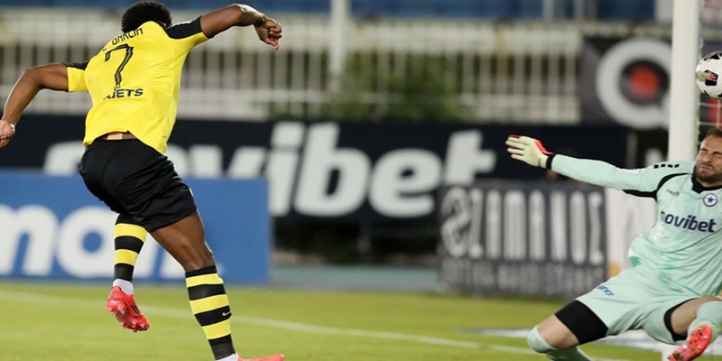 Με ένα μεγάλο χαμόγελο, ο σκόρερ της αναμέτρησης με τον Ατρόμητο, Λιβάι Γκαρσία πόζαρε μπροστά στην εστία που πέτυχε το γκολ που χάρισε τη νίκη στην ΑΕΚ.