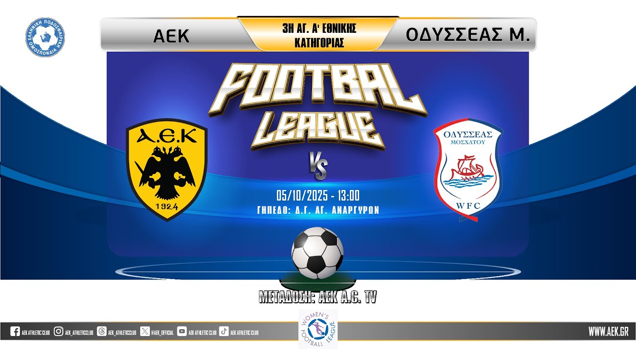 Η ΑΕΚ αντιμετωπίζει τον Οδυσσέα Μοσχάτου για την 3η αγωνιστική της Women’s Football League. Η ομάδα της Ένωσης θέλει να συνεχίσει τις θετικές της εμφανίσεις και να διεκδικήσει μια ακόμη νίκη. Ο αγώνας μεταδίδεται ζωντανά μέσω YouTube από το κανάλι AEK Athletic Club.