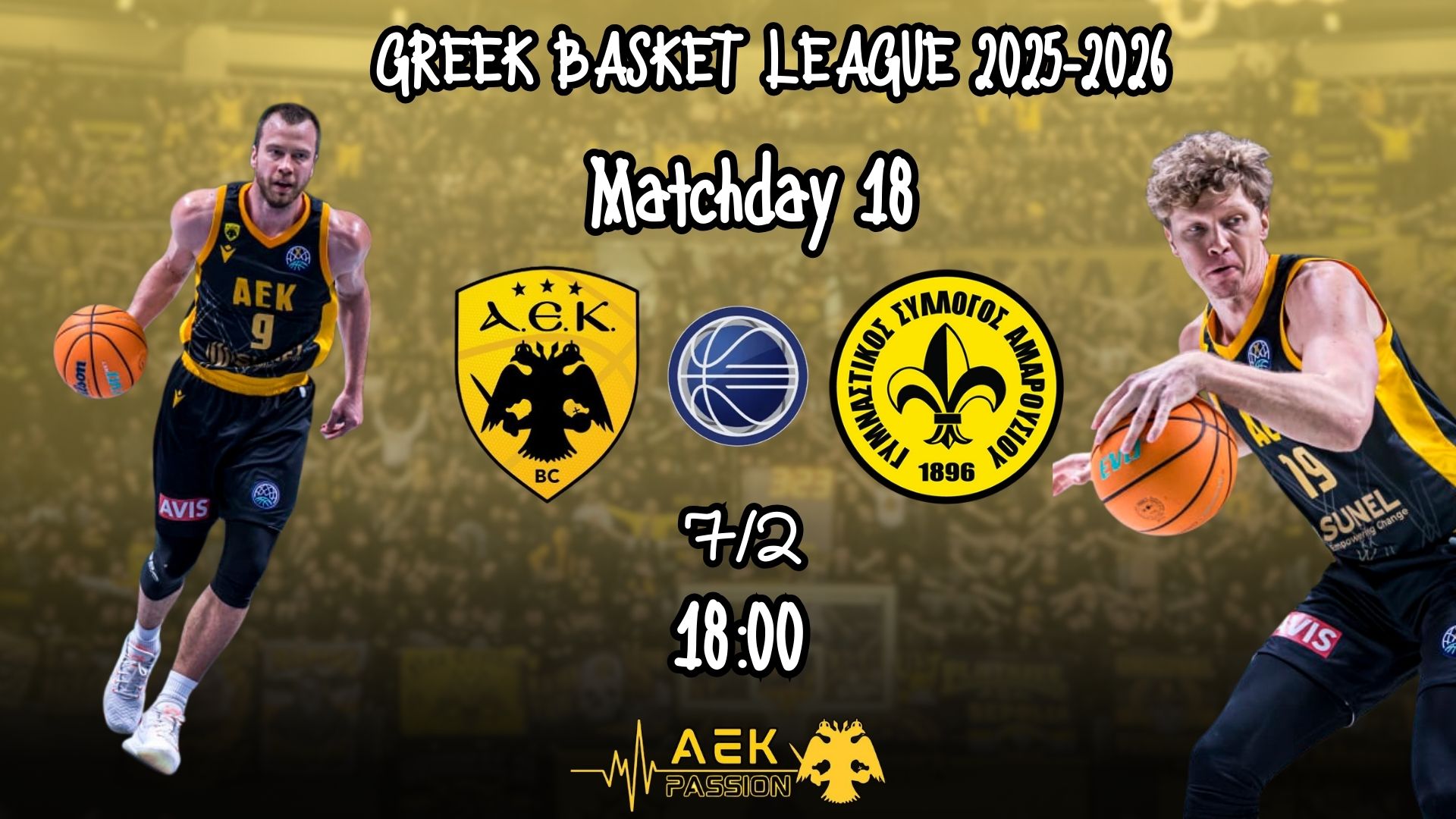 Η ΑΕΚ, έπειτα από την πολύτιμη νίκη της στην Τουρκία επί της Τόφας με 90-93 για την 3η αγωνιστική του Basketball Champions League, φιλοξενεί σήμερα το απόγευμα το Μαρούσι στη «SUNEL Arena» στο πλαίσιο της 18ης αγωνιστικής της Basket League.