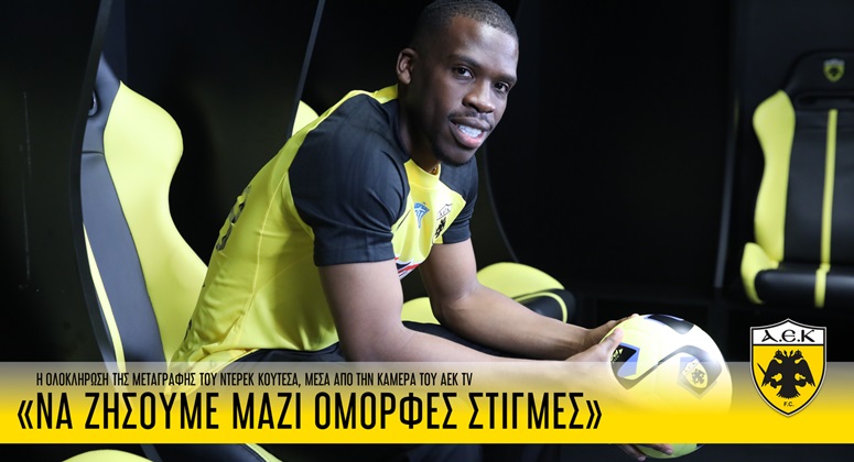 “Γεια σας φίλοι της ΑΕΚ. Είμαι ο Ντέρεκ Κουτέσα. Είμαι 27 χρονών και αγωνίζομαι ως winger. Είναι μεγάλη μου τιμή και χαρά που είμαι μέλος της οικογένειας της ΑΕΚ.