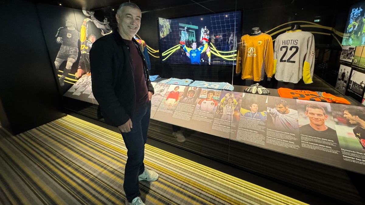 Ξεναγήθηκε στις προθήκες του Μουσείου, όπου εκτίθενται πολυάριθμα κειμήλια από την καριέρα του. Και βέβαια στάθηκε περισσότερο στην προθήκη της προσωρινής έκθεσης, που τους πρόσφατους μήνες είναι αφιερωμένη στους «Τερματο-φύλακες Άγγελους» της ΑΕΚ, από το 1924 μέχρι σήμερα».