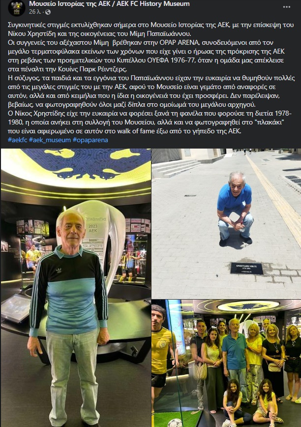 Στο Μουσείο Ιστορίας της ΑΕΚ στην “Αγιά Σοφιά-OPAP Arena” βρέθηκε σήμερα ο Νίκος Χρηστίδης μαζί με την οικογένεια του Μίμη Παπαϊωάννου.