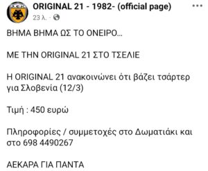 Η Original 21 μέσω δημοσίευσης στα κοινωνικά δίκτυα ανακοίνωσε πως θα μισθώσει πτήση τσάρτερ προκειμένου να εξυπηρετήσει οπαδούς του «Δικέφαλου» που επιθυμούν να ταξιδέψουν με την ΑΕΚ στο Τσέλιε.