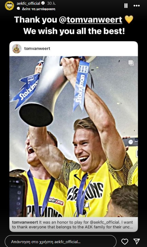 Παρελθόν αποτελεί κι επίσημα από την ΑΕΚ ο Τομ Φαν Βέερτ.