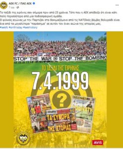 25 χρόνια συμπληρώνονται σήμερα από την 7η Απριλίου 1999, όταν η ΑΕΚ νίκησε τον πόλεμο, κάνοντας ένα ταξίδι ενδεχομένως απέναντι σε κάθε λογική: πήγε στο Βελιγράδι, μεσούντων των βομβαρδισμών από το ΝΑΤΟ, με ένα και μόνο μήνυμα: να επανέλθει άμεσα η ειρήνη. Το φιλικό εκείνο παιχνίδι με την Παρτιζάν έστειλε ηχηρό μήνυμα απέναντι στη βαρβαρότητα του πολέμου και αποτελεί άλλη μια απόδειξη του λόγου για τον οποίο η ΑΕΚ δεν είναι απλώς μια ποδοσφαιρική ομάδα, αλλά κάτι πολύ περισσότερο.