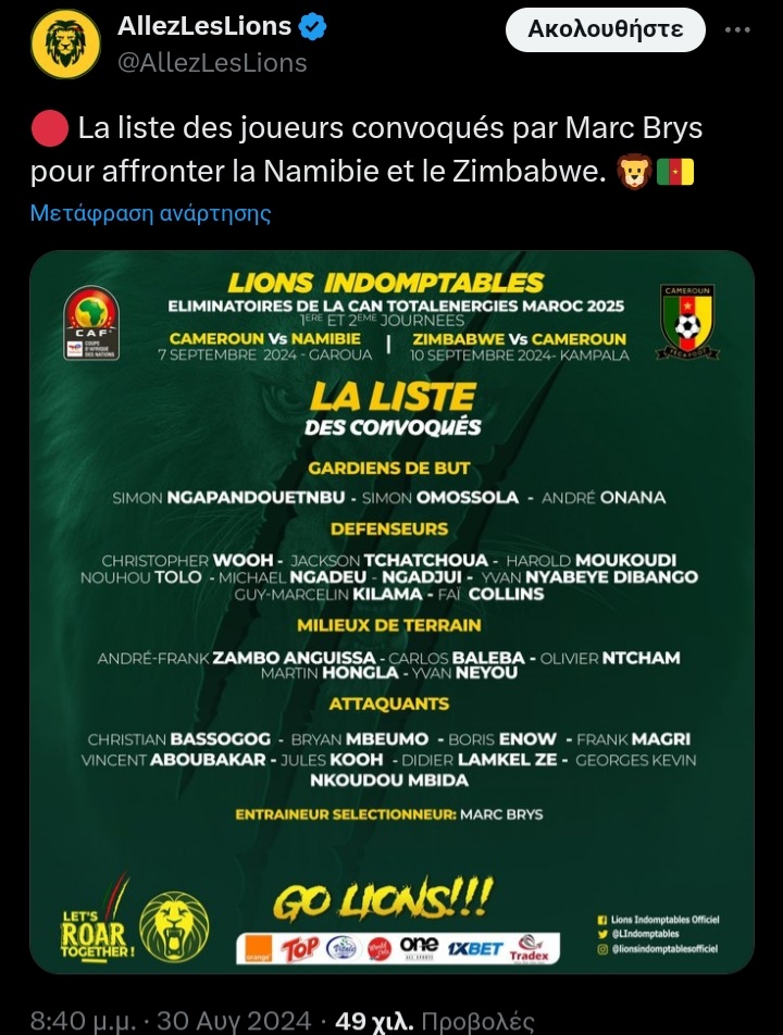 Αναλυτικά η λίστα των παικτών της Εθνικής Καμερούν: