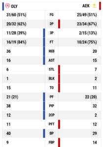 ΑΕΚ (Ντράγκαν Σάκοτα): Φλιώνης 1, Χέιλ 14, Κουζμίνσκας 6, Γκόλντεν 10, Κουζέλογλου 4, Χαμπ 2, Σκορδίλης 4, Καράμπελας, Νετζήπογλου 6, Γκρέι 10, Μπράις 10