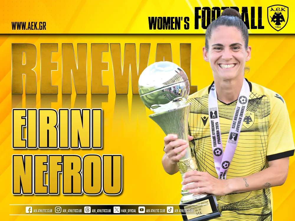 ”Η ΑΕΚ βρίσκεται στην ευχάριστη θέση να ανακοινώσει την ανανέωση της συνεργασίας της με την Ειρήνη Νεφρού. Η 31χρονη (13/05/1994) αμυντικός υπέγραψε το νέο της συμβόλαιο και θα παραμείνει στο δυναμικό της Γυναικείας ομάδας Ποδοσφαίρου του Συλλόγου και για την επόμενη σεζόν!