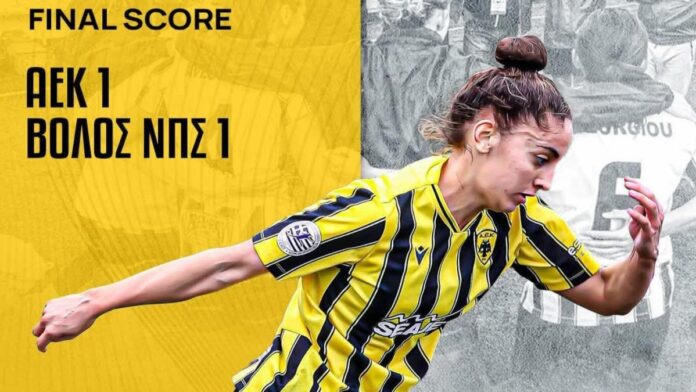 Η γυναικεία ομάδα ποδοσφαίρου της ΑΕΚ αναδείχθηκε ισόπαλη με τον ΝΠΣ Βόλο στους Αγίους Αναργύρους στο πλαίσιο της 10ης αγωνιστική του Πρωταθλήματος της Α’ Εθνικής Κατηγορίας.