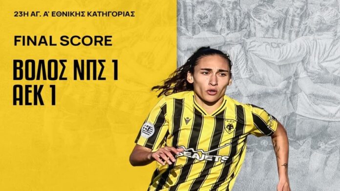Ισόπαλη 1-1 ήρθε η γυναικεία ομάδα ποδοσφαίρου της ΑΕΚ με τον ΝΠΣ Βόλο, στην ομώνυμη πόλη, στο πλαίσιο της 23ης αγωνιστικής της Α’ Εθνικής Κατηγορίας. Η «Ένωση» βρέθηκε πίσω στο σκορ, ωστόσο ισοφάρισε, ενώ είχε τεράστιες ευκαιρίες στο φινάλε για την πλήρη ανατροπή. Το παιχνίδι, επίσης, σημαδεύτηκε από την απόφαση του διαιτητή, Γιώργου Ασλανίδη, να δώσει επιθετικό φάουλ σε πέναλτι-μαρς πάνω στη Βιολάρη στο 85ο λεπτό! Εκτός αποστολής έμειναν λόγω ενοχλήσεων Κόγγουλη και Ποπαντίνοβα συν φυσικά τις τραυματίες Στεφάτου, Στίβελμανς, Παυλοπούλου, Μπαρτζακλή και Κωνσταντινίδου.