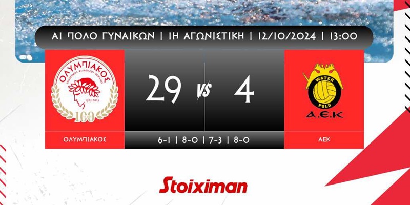 Την ήττα με σκορ 29-4 από τον Ολυμπιακό γνώρισε η γυναικεία ομάδα πόλο της ΑΕΚ στο “Παπαστράτειο”, στην αναμέτρηση που διεξήχθη στο πλαίσιο της 1ης αγωνιστικής του Πρωταθλήματος της Α1 Γυναικών.
