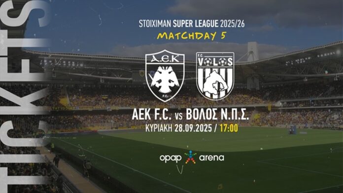 Με ανακοίνωση της η ΠΑΕ ΑΕΚ γνωστοποίησε την έναρξη της κυκλοφορίας των εισιτηρίων για τον εντός έδρας αγώνα με αντίπαλο τον Βόλο, ο οποίος θα πραγματοποιηθεί την επόμενη Κυριακή (28/9) στο πλαίσιο της 5ης αγωνιστικής της Stoiximan Super League.