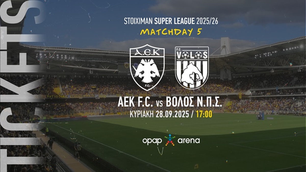 «Η ΠΑΕ ΑΕΚ ανακοινώνει ότι άρχισε η διάθεση των εισιτηρίων για το ματς της 5ης αγωνιστικής του Πρωταθλήματος απέναντι στον Βόλο ΝΠΣ, που θα διεξαχθεί την Κυριακή 28 Σεπτεμβρίου στις 17:00, στην OPAP Arena.