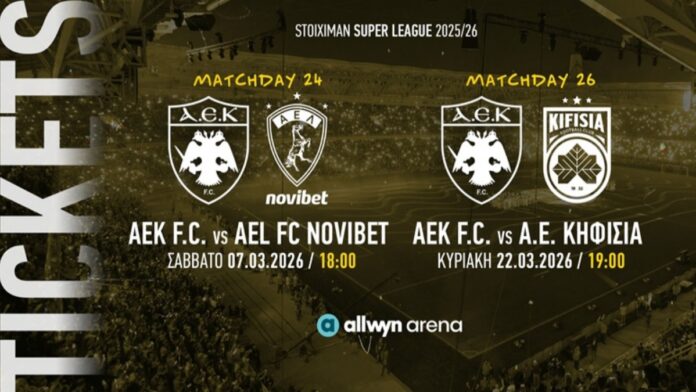 Η ΠΑΕ ΑΕΚ ανακοινώνει ότι άρχισε η διάθεση των εισιτηρίων για τα ματς της 24ης και της 26ης αγωνιστικής της STOIXIMAN Super League 2025-26 στην ALLWYN Arena, με αντιπάλους την AEL FC Novibet (7/3 – 18:00) και την Κηφισιά (22/3 – 19:00) αντίστοιχα.