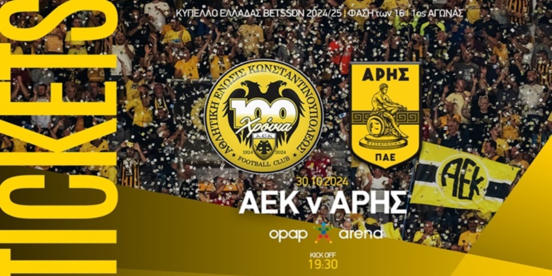 Η ΠΑΕ ΑΕΚ ανακοινώνει ότι άρχισε η διάθεση των εισιτηρίων για τον αγώνα Κυπέλλου απέναντι στον Άρη, που θα διεξαχθεί την Τετάρτη 30 Οκτωβρίου στις 19.30, στην OPAP Arena.