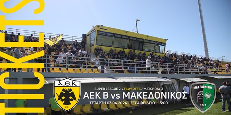Η ΠΑΕ ΑΕΚ ενημερώνει ότι έχει τεθεί σε λειτουργία το ηλεκτρονικό εισιτήριο για τον αγώνα ΑΕΚ B – ΜΑΚΕΔΟΝΙΚΟΣ για την 3η αγωνιστική των Play Offs της Super League 2, την Τετάρτη 3/4/2024 στις 15:00 Σεραφείδειο.