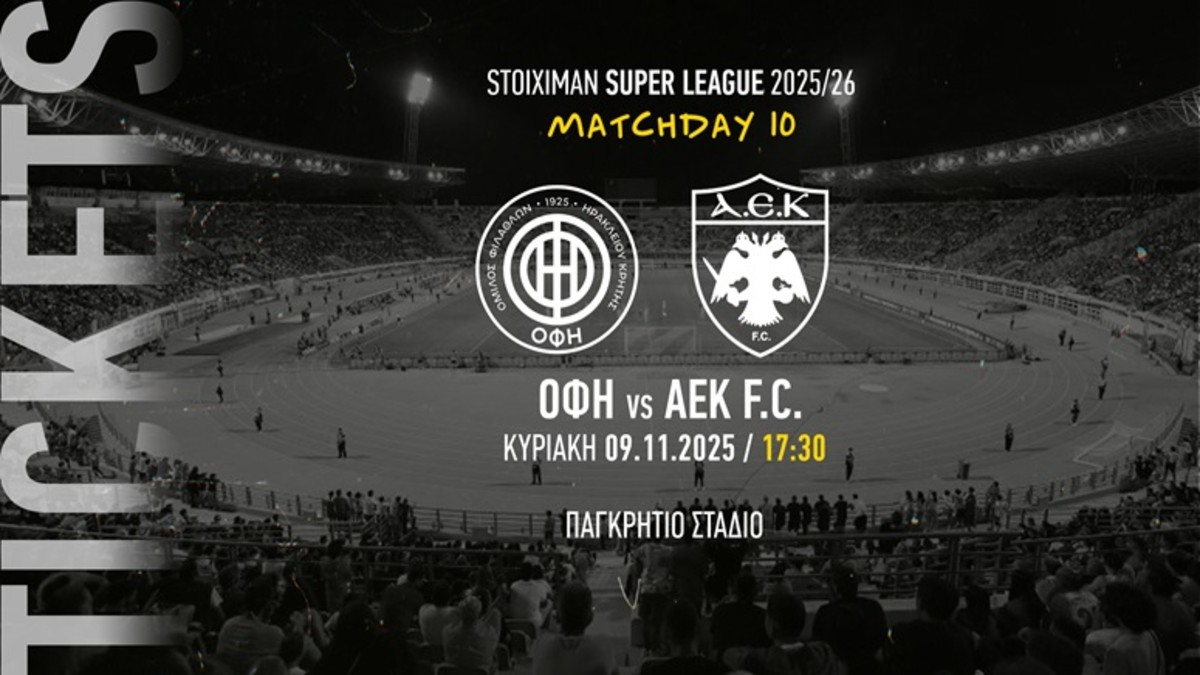 «Η ΠΑΕ ΑΕΚ ενημερώνει τους φιλάθλους ότι άρχισε η διάθεση των εισιτηρίων για την εκτός έδρας αναμέτρηση της 10ης αγωνιστικής της STOIXIMAN Super League 2025-2026 με τον ΟΦΗ, την Κυριακή 9 Νοεμβρίου (17:30) στο Παγκρήτιο Στάδιο.