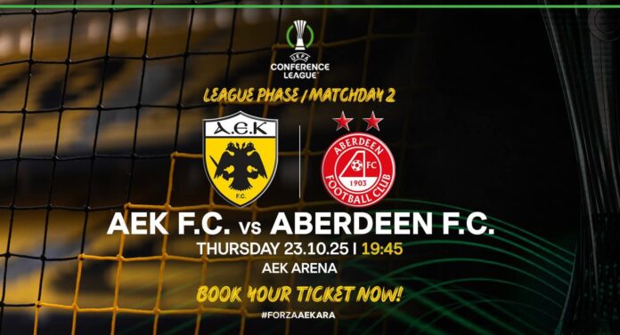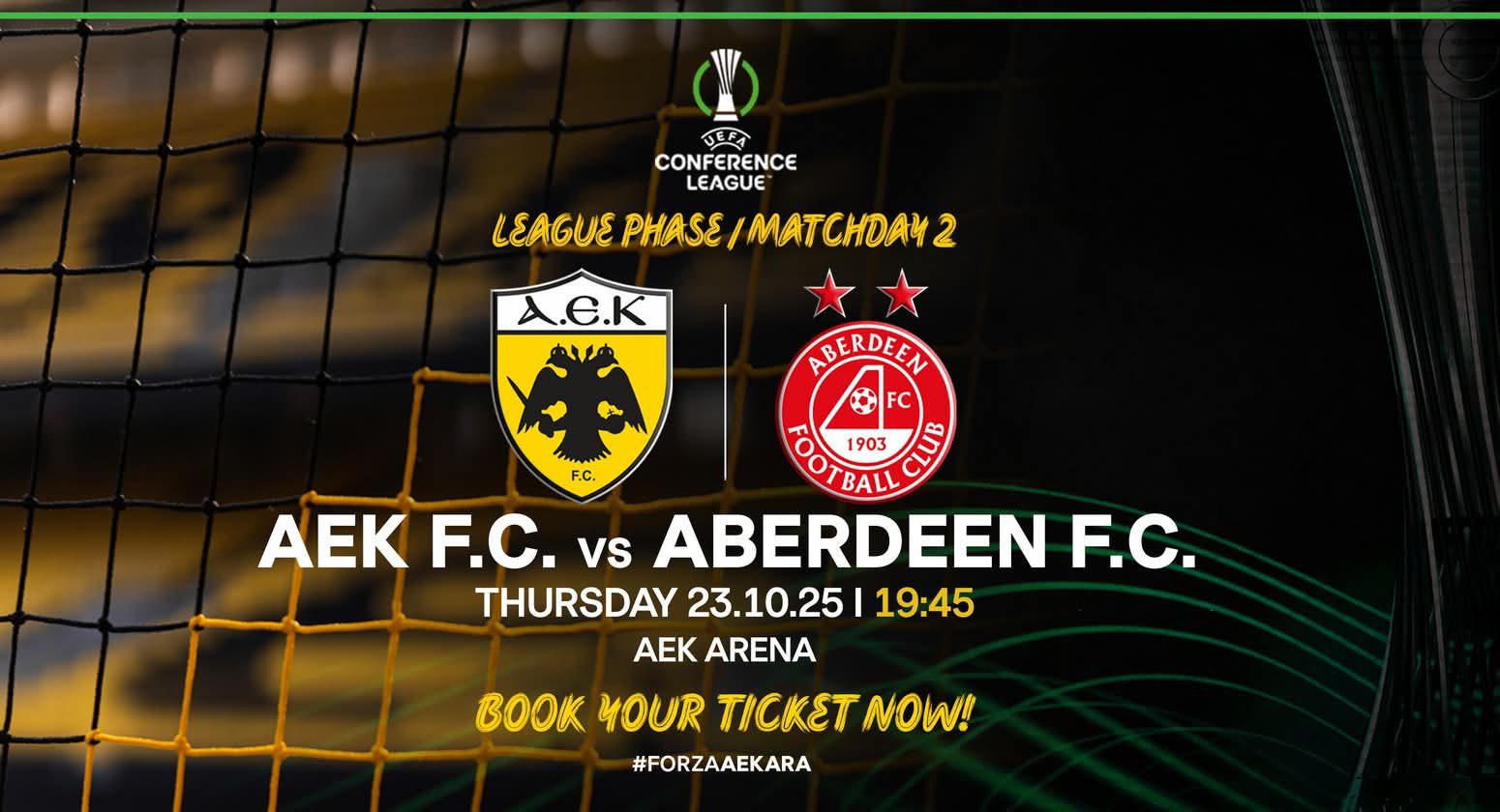 Η ΠΑΕ ΑΕΚ ενημερώνει ότι οι κάτοχοι εισιτηρίου διαρκείας που δεν έχουν προμηθευτεί το πακέτο εισιτηρίων των εντός έδρας αγώνων της League Phase του UEFA Conference League, μπορούν να διασφαλίσουν τη θέση τους για τον αγώνα με την Aberdeen FC, ο οποίος θα διεξαχθεί στην OPAP Arena την Πέμπτη 23 Οκτωβρίου στις 19:45.