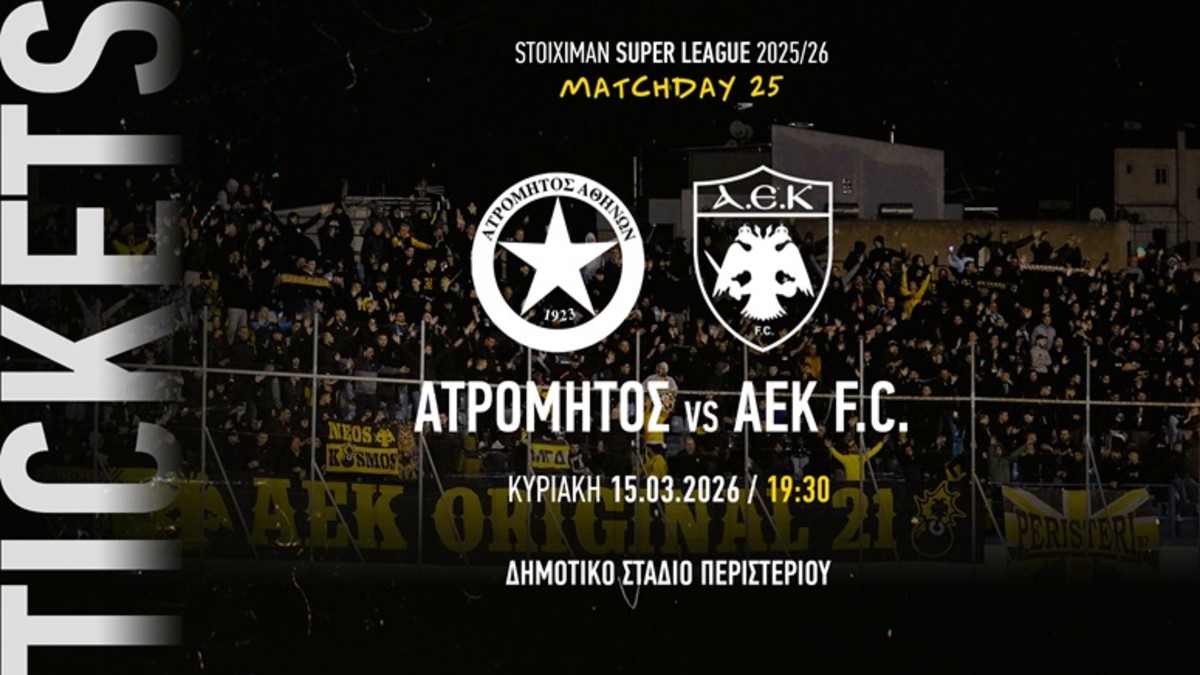 «Η ΠΑΕ ΑΕΚ ενημερώνει τους φιλάθλους της ότι άρχισε η διάθεση των εισιτηρίων για την εκτός έδρας αναμέτρηση της 25ης αγωνιστικής της STOIXIMAN Super League 2025-26, με αντίπαλο τον Ατρόμητο, η οποία θα διεξαχθεί την Κυριακή 15 Μαρτίου (19:30) στο Δημοτικό Στάδιο Περιστερίου.