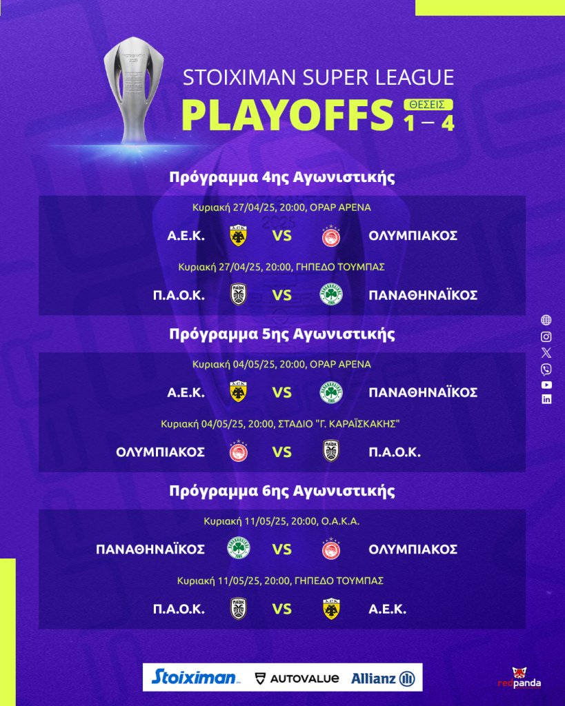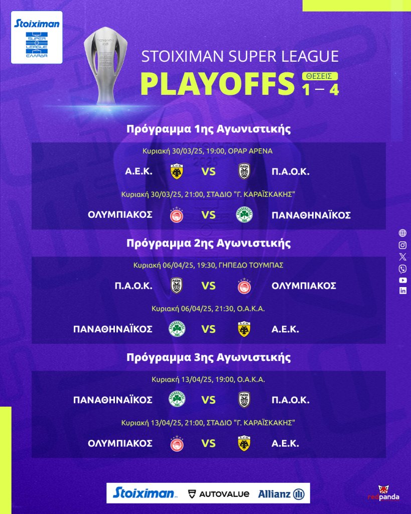Γνωστό έγινε σήμερα Τετάρτη (12/3) το αναλυτικό πρόγραμμα (σ.σ. ημέρες και ώρες)των Playoff της Stoiximan Super League.