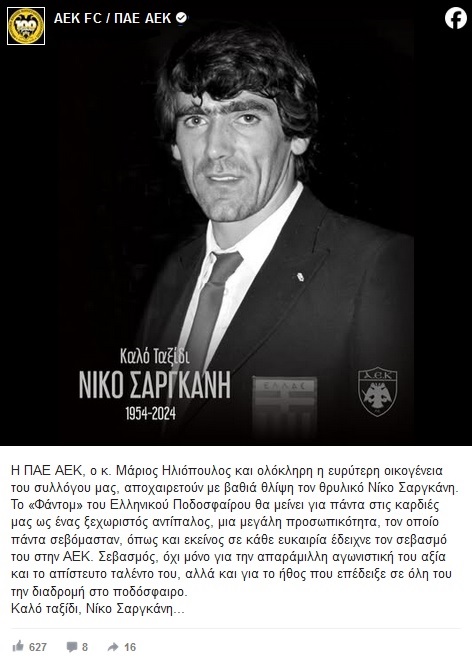 «Η ΠΑΕ ΑΕΚ, ο κ. Μάριος Ηλιόπουλος και ολόκληρη η ευρύτερη οικογένεια του συλλόγου μας, αποχαιρετούν με βαθιά θλίψη τον θρυλικό Νίκο Σαργκάνη.