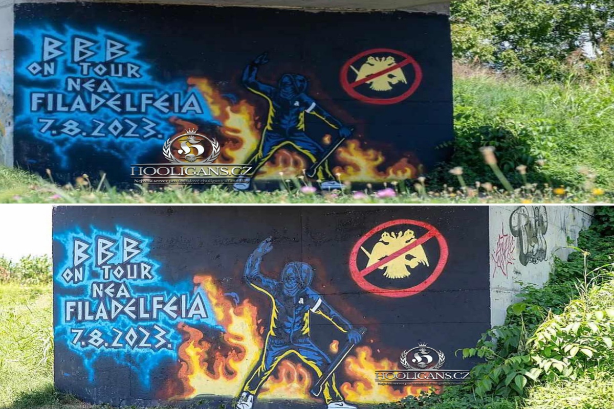 Ακόμα και η ντροπή θα ντρεπόταν με το αισχρό γκράφιτι των ΒΒΒ της Ντινάμο Ζάγκρεμπ, οι οποίοι ουσιαστικά… διαφημίζουν τη φονική επιδρομή στη Νέα Φιλαδέλφεια τον περασμένο Αύγουστο, όπου μαζί με τους Έλληνες συνεργούς τους προκάλεσαν τα εγκληματικά επεισόδια που οδήγησαν στη δολοφονία του Μιχάλη Κατσούρη, φίλου της ΑΕΚ, έξω από το γήπεδο της ομάδας.